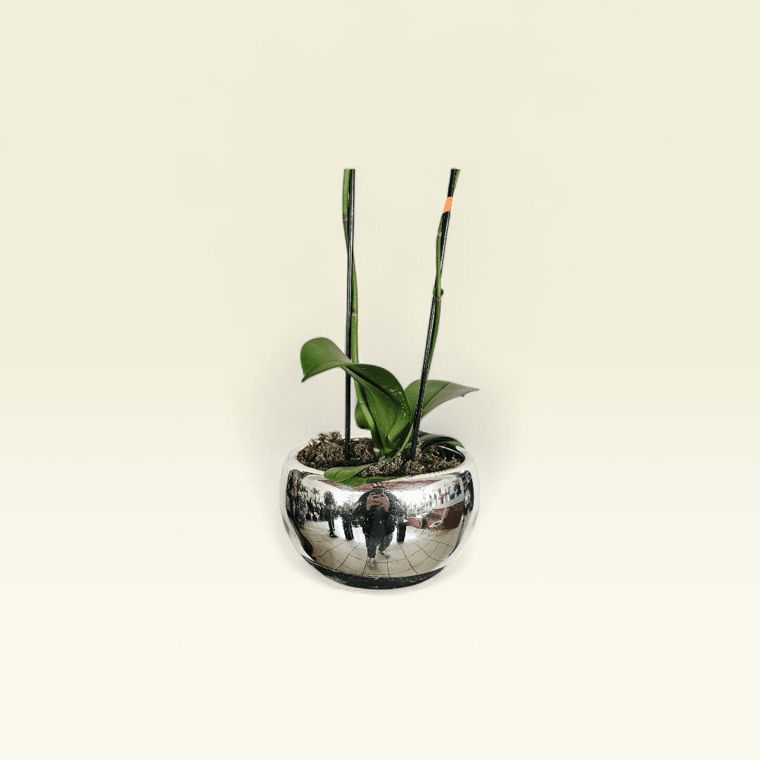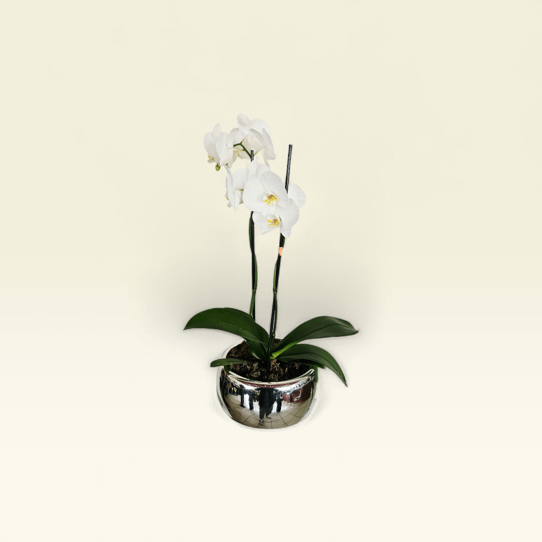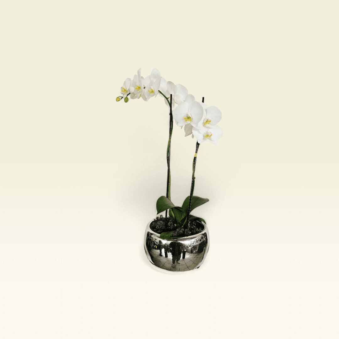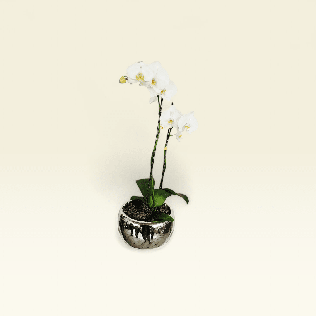 Esta orquídea natural de flor blanca se presenta en una moderna esfera de vidrio color plata que refleja la luz y aporta un acabado contemporáneo y distinguido.